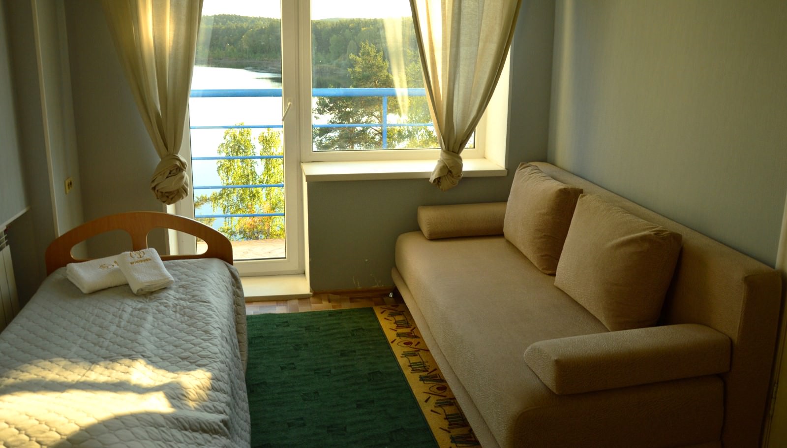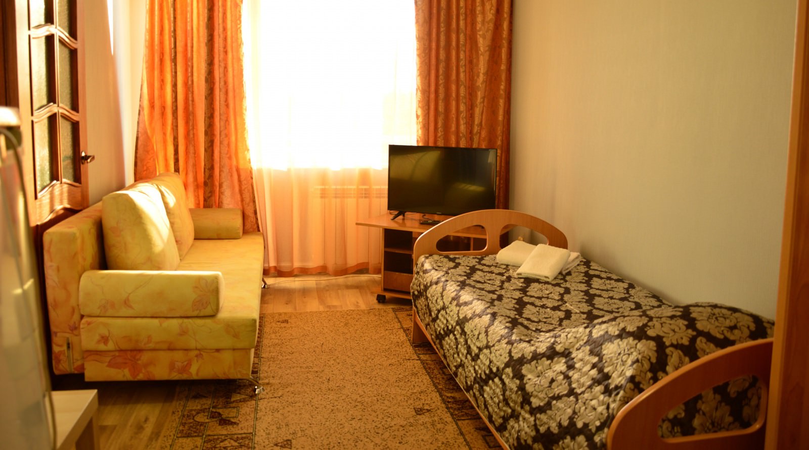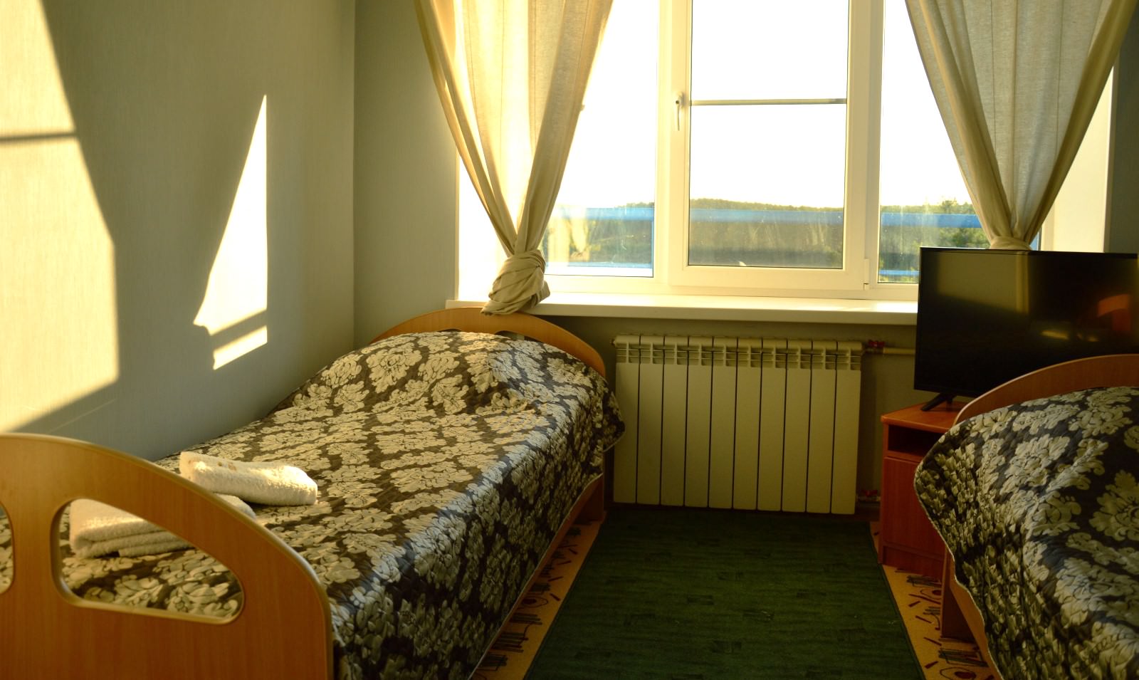 Площадь номера - 20 кв.м. 3 осн. места. 1 доп. место. Мебель: диван, кровати односпальные, прикроватные тумбочки, шкаф. Оборудование: мини-холодильник, телевизор. Санузел. Сервис: смена полотенец, смена постельного белья, уборка номера.