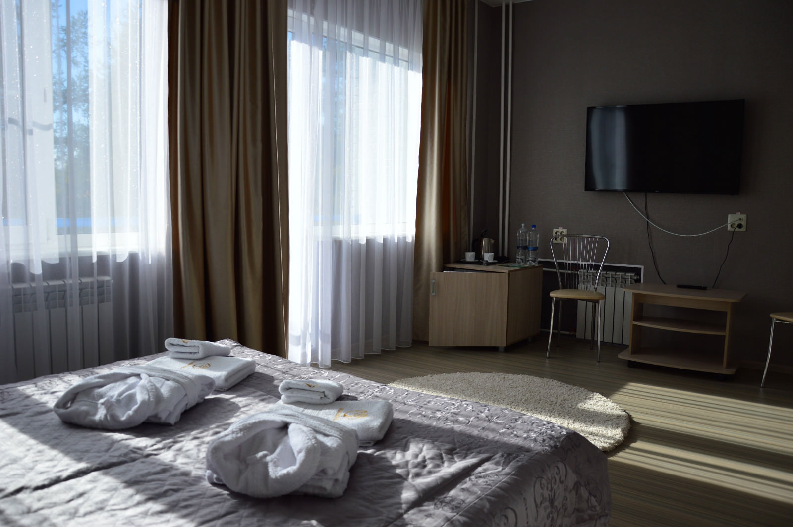 Площадь номера - 20 кв.м. 2 осн. места. Балкон. Мебель: диван, кровать двуспальная, прикроватные тумбочки, столик журнальный, стулья, тумба под холодильник, шкаф. Оборудование: мини-холодильник, телевизор, чайный набор посуды, электрочайник. Санузел: с душем, тапочки, туалетные принадлежности, фен, халат. Сервис: смена полотенец, смена постельного белья, уборка номера.