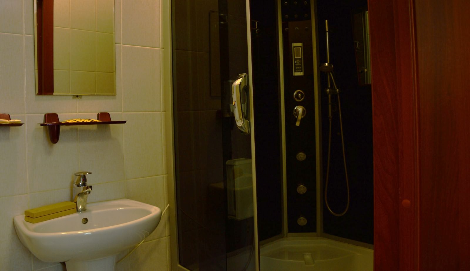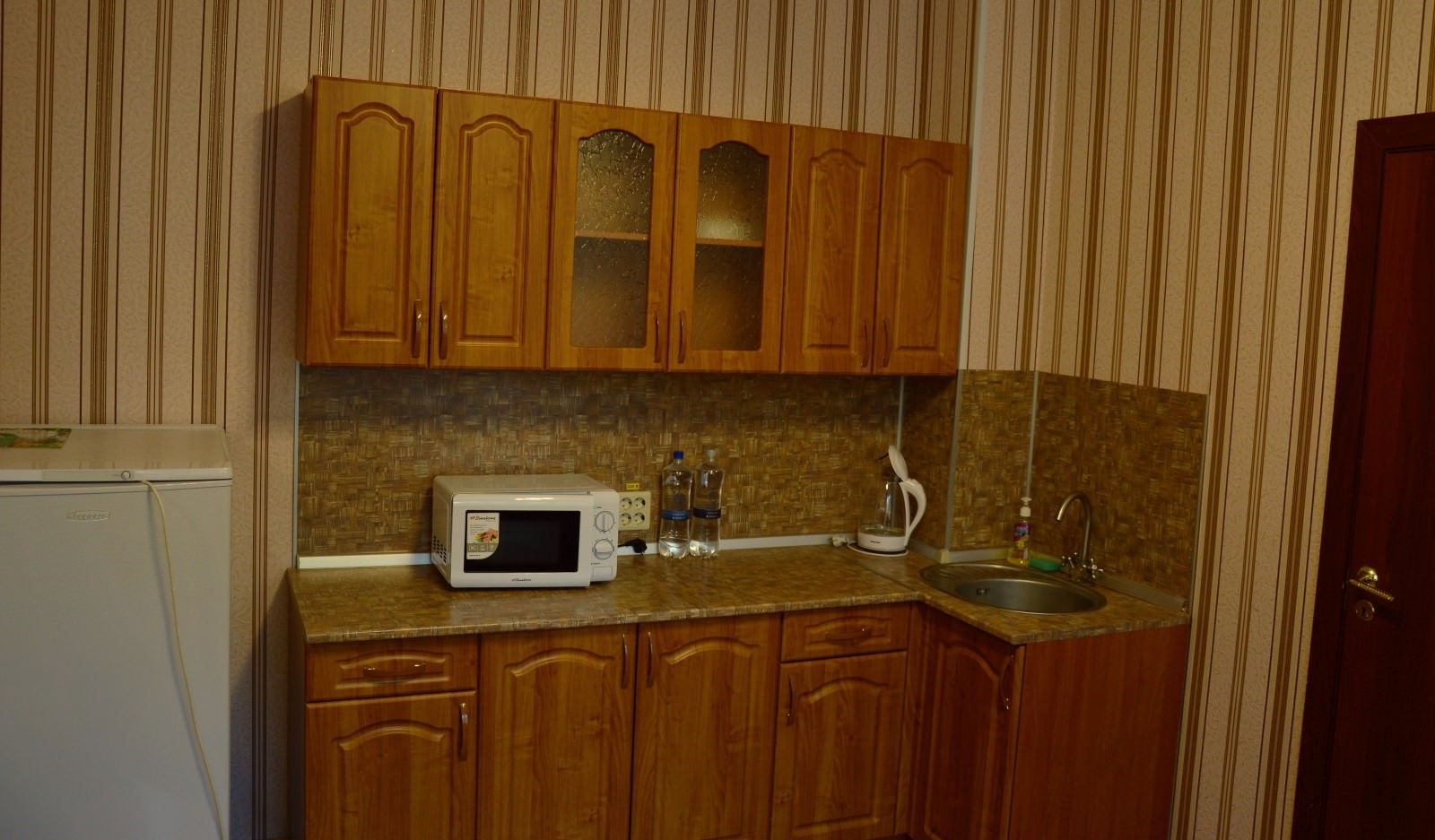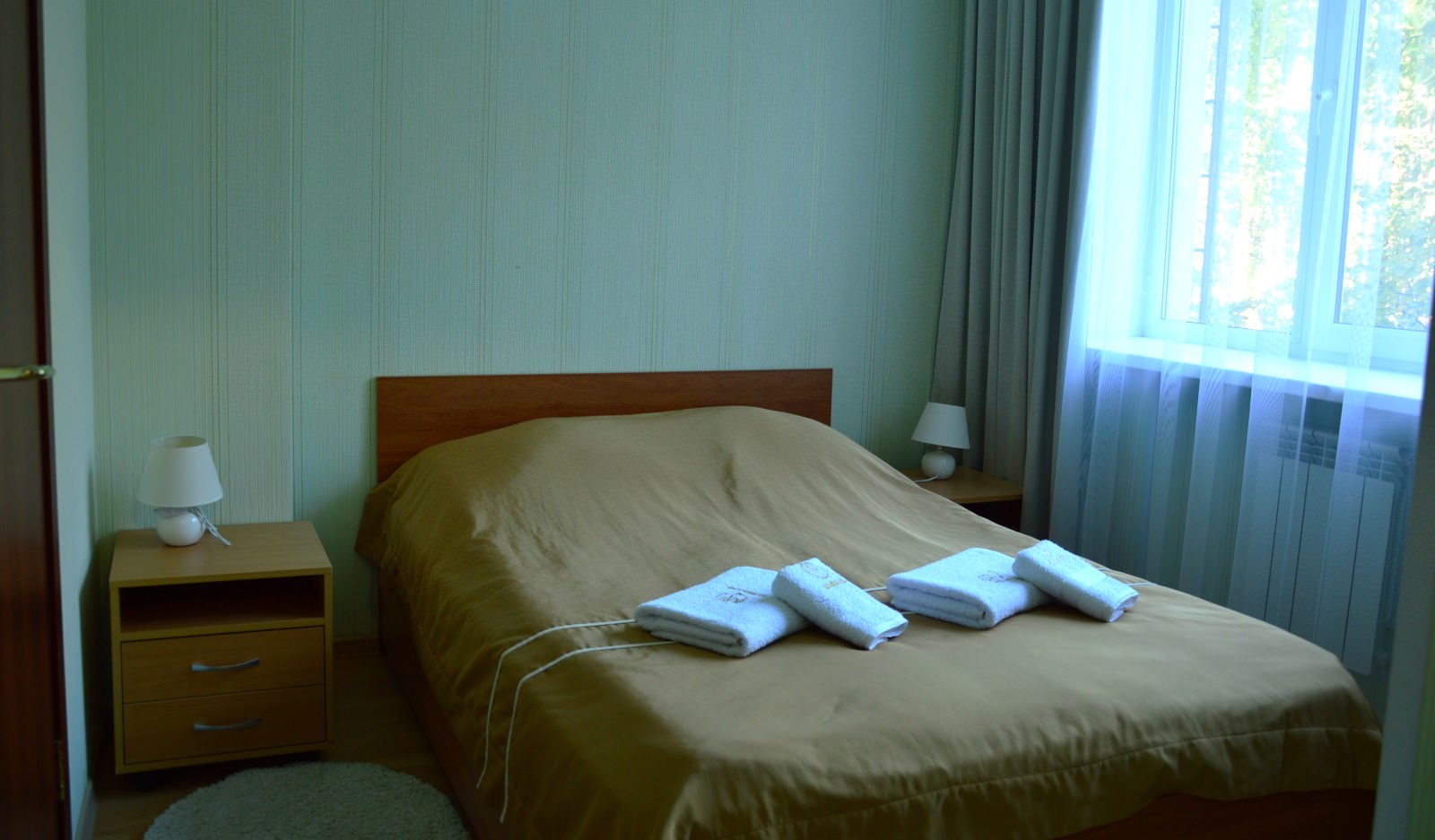 Площадь номера - 30 кв.м. 4 осн. места. 2 доп. места. Мебель: диван раскладной, кровати односпальные (2 шт.), кровать двуспальная, кухонная мебель, прикроватные тумбочки, стол, стулья, тумба под телевизор, шкаф. Мини-кухня. Оборудование: микроволновая печь, набор посуды, телевизор, холодильник, электрочайник. Санузел: с душем, тапочки, туалетные принадлежности, фен, халат. Сервис: смена полотенец, смена постельного белья, уборка номера.